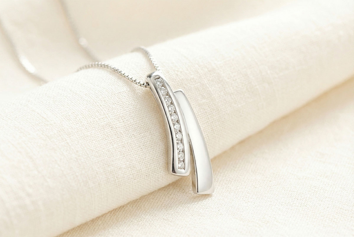 Een glanzende witgouden band en een witgouden band met diamanten is opgehangen aan een witgouden Venetiaanse ketting.