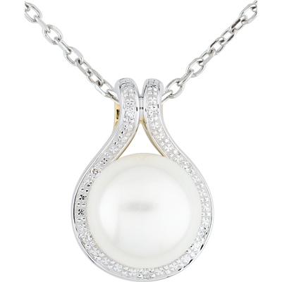 Een witte parel wordt gedragen door een gouden lint met diamanten.