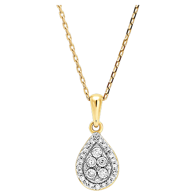 Schitter met een peervormige pavé diamanten hanger met daarop een halo van diamanten.Een fijne en subtiele wit en geelgouden hanger, geïnspireerd door tijdloze elegantie.