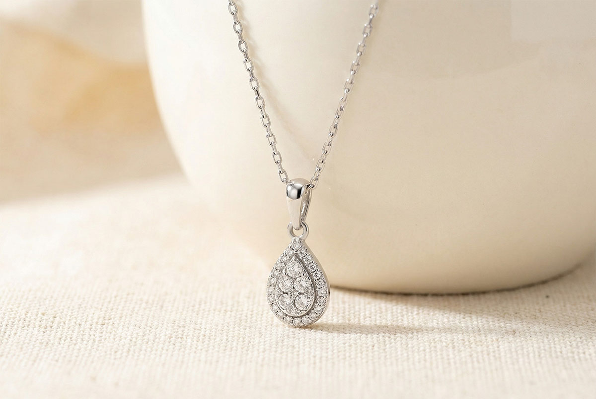 Schitter met een peervormige pavé diamanten hanger met daarop een halo van diamanten.Een fijne en subtiele witgouden hanger, geïnspireerd door tijdloze elegantie.