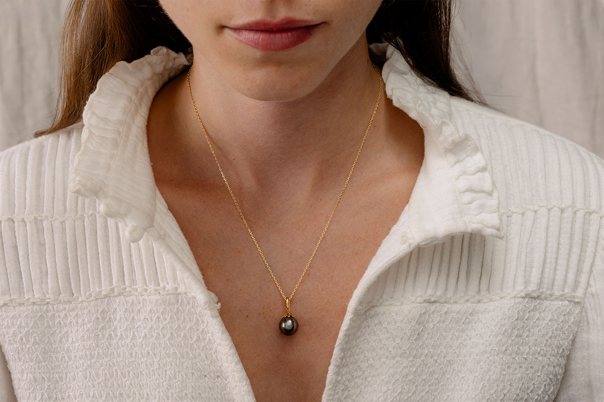 Een sublieme grijze parel in druppelvorm is gehangen door een geelgouden kroon.