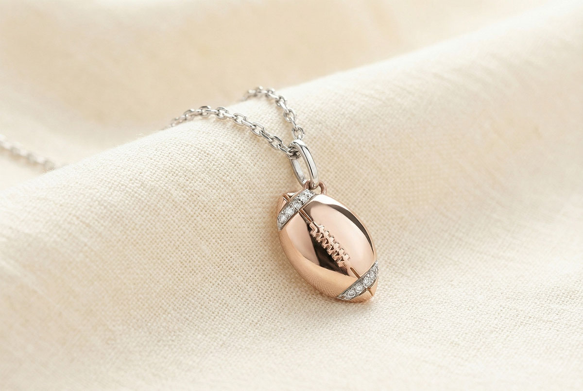 Hanger in de vorm van een rugbybal afgerond in roségoud en witte diamanten.
