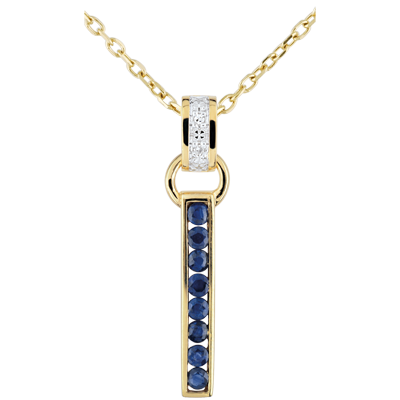Een band van Saffieren, elegant en tijdloos, wordt opgeschort door een lus om een diamanten beugel.