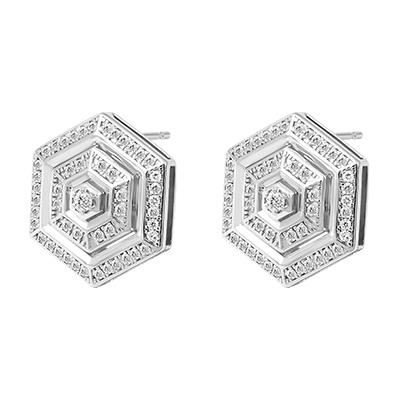 De "Hexad" oorbellen in witgoud schitteren door hun hexagonale motief bezaaid met diamanten. Ze bieden een moderne en tijdloze elegantie, die het licht bij elke beweging vangt.