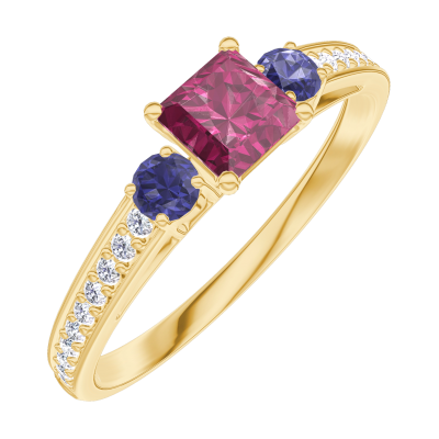 « L'ATELIER » NR. 160765Ring Geelgoud 18 karaat - Robijn Prinses 0.3 Karaat - Aanleunende edelstenen Blauwe saffier - Setting Diamant