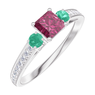« L'ATELIER » Nº160787Ring Witgoud 18 karaat - Robijn Prinses 0.3 Karaat - Aanleunende edelstenen Smaragd - Setting Diamant