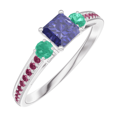 « L'ATELIER » Nº161392Ring Witgoud 9 karaat - Blauwe saffier Prinses 0.3 Karaat - Aanleunende edelstenen Smaragd - Setting Robijn
