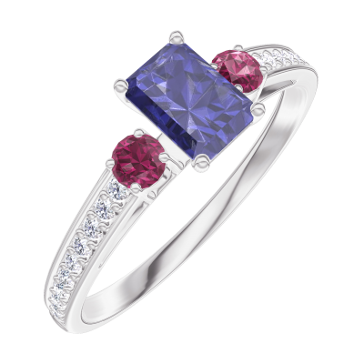 « L'ATELIER » NR. 161448Ring Witgoud 9 karaat - Blauwe saffier Rechthoekig 0.3 Karaat - Aanleunende edelstenen Robijn - Setting Diamant