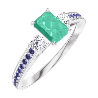 « L'ATELIER » Nº162036Ring Witgoud 9 karaat - Smaragd Rechthoekig 0.3 Karaat - Aanleunende edelstenen Diamant - Setting Blauwe saffier