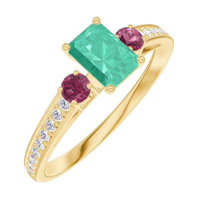 « L'ATELIER » Nº162046Ring Geelgoud 9 karaat - Smaragd Rechthoekig 0.3 Karaat - Aanleunende edelstenen Robijn - Setting Diamant