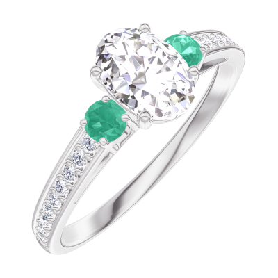 « L'ATELIER » Nº162788Ring Witgoud 9 karaat - Diamant Ovaal 0.5 Karaat - Aanleunende edelstenen Smaragd - Setting Diamant