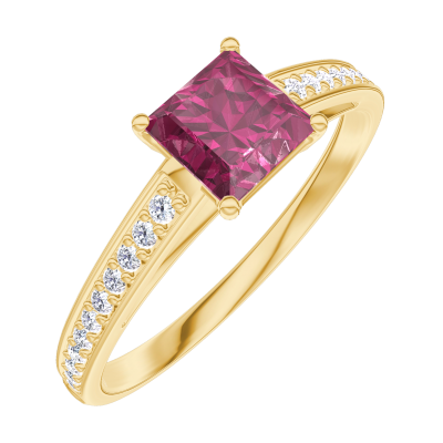 « L'ATELIER » Nº163105Ring Geelgoud 18 karaat - Robijn Prinses 0.5 Karaat - Setting Diamant