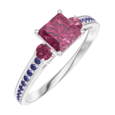 « L'ATELIER » Nº163156Ring Witgoud 9 karaat - Robijn Prinses 0.5 Karaat - Aanleunende edelstenen Robijn - Setting Blauwe saffier