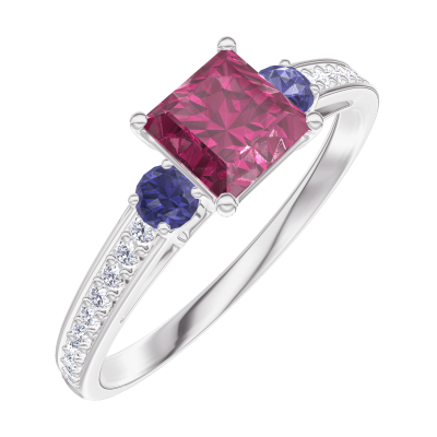 « L'ATELIER » NR. 163168Ring Witgoud 9 karaat - Robijn Prinses 0.5 Karaat - Aanleunende edelstenen Blauwe saffier - Setting Diamant
