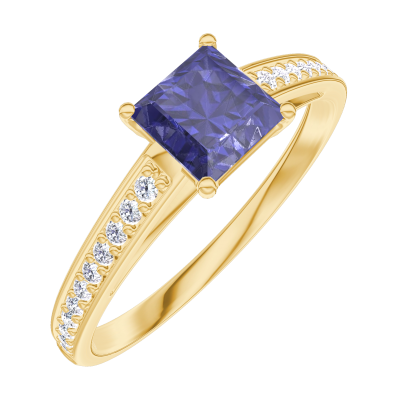 « L'ATELIER » Nº163706Ring Geelgoud 9 karaat - Blauwe saffier Prinses 0.5 Karaat - Setting Diamant