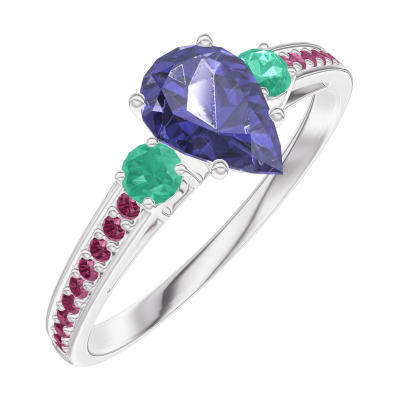 « L'ATELIER » Nº164092Ring Witgoud 9 karaat - Blauwe saffier Peer 0.5 Karaat - Aanleunende edelstenen Smaragd - Setting Robijn