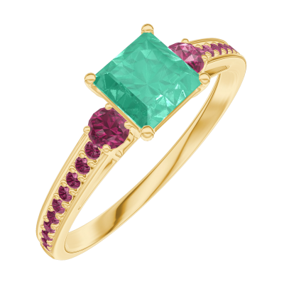 « L'ATELIER » NR. 164350Ring Geelgoud 9 karaat - Smaragd Prinses 0.5 Karaat - Aanleunende edelstenen Robijn - Setting Robijn