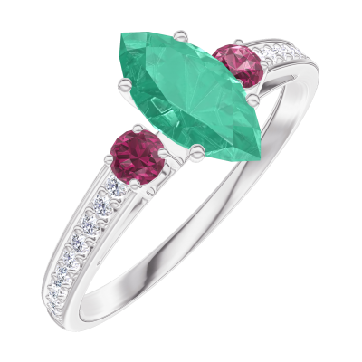 « L'ATELIER » NR. 164748Ring Witgoud 9 karaat - Smaragd Markies 0.5 Karaat - Aanleunende edelstenen Robijn - Setting Diamant