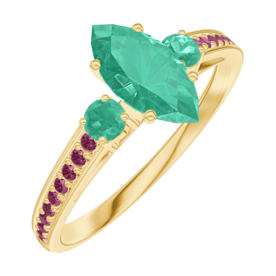 « L'ATELIER » Nº164790Ring Geelgoud 9 karaat - Smaragd Markies 0.5 Karaat - Aanleunende edelstenen Smaragd - Setting Robijn