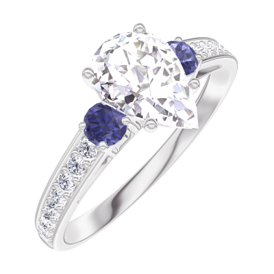 « L'ATELIER » Nº165268Ring Witgoud 9 karaat - Diamant Peer 0.7 Karaat - Aanleunende edelstenen Blauwe saffier - Setting Diamant