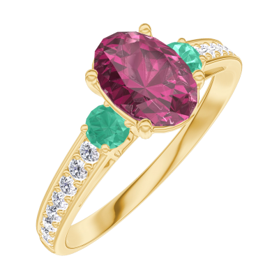 « L'ATELIER » Nº165785Ring Geelgoud 18 karaat - Robijn Ovaal 0.7 Karaat - Aanleunende edelstenen Smaragd - Setting Diamant