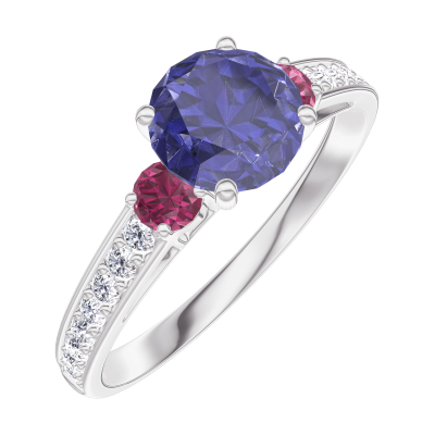 « L'ATELIER » NR. 166047Ring Witgoud 18 karaat - Blauwe saffier rond 0.7 Karaat - Aanleunende edelstenen Robijn - Setting Diamant 4.9