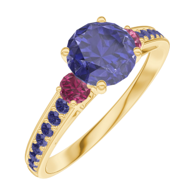 « L'ATELIER » NR. 166054Ring Geelgoud 9 karaat - Blauwe saffier rond 0.7 Karaat - Aanleunende edelstenen Robijn - Setting Blauwe saffier 4.9
