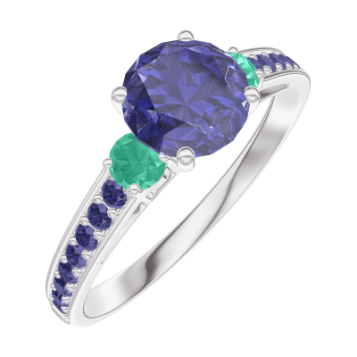 « L'ATELIER » NR. 166096Ring Witgoud 9 karaat - Blauwe saffier rond 0.7 Karaat - Aanleunende edelstenen Smaragd - Setting Blauwe saffier 4.9