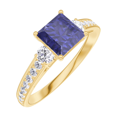 « L'ATELIER » Nº166126Ring Geelgoud 9 karaat - Blauwe saffier Prinses 0.7 Karaat - Aanleunende edelstenen Diamant - Setting Diamant