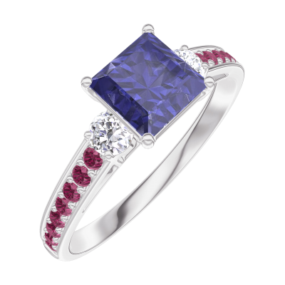 « L'ATELIER » Nº166132Ring Witgoud 9 karaat - Blauwe saffier Prinses 0.7 Karaat - Aanleunende edelstenen Diamant - Setting Robijn
