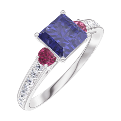« L'ATELIER » NR. 166148Ring Witgoud 9 karaat - Blauwe saffier Prinses 0.7 Karaat - Aanleunende edelstenen Robijn - Setting Diamant