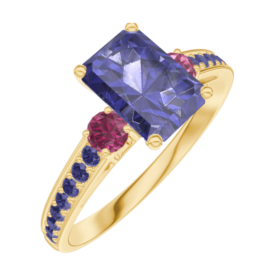 « L'ATELIER » NR. 166253Ring Geelgoud 18 karaat - Blauwe saffier Rechthoekig 0.7 Karaat - Aanleunende edelstenen Robijn - Setting Blauwe saffier