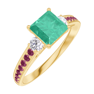 « L'ATELIER » NR. 166730Ring Geelgoud 9 karaat - Smaragd Prinses 0.7 Karaat - Aanleunende edelstenen Diamant - Setting Robijn