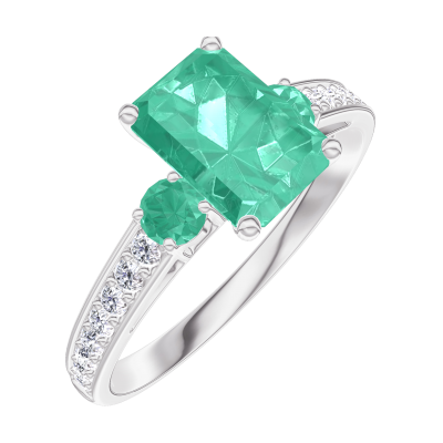 « L'ATELIER » Nº166887Ring Witgoud 18 karaat - Smaragd Rechthoekig 0.7 Karaat - Aanleunende edelstenen Smaragd - Setting Diamant