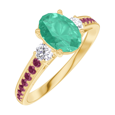 « L'ATELIER » NR. 166930Ring Geelgoud 9 karaat - Smaragd Ovaal 0.7 Karaat - Aanleunende edelstenen Diamant - Setting Robijn