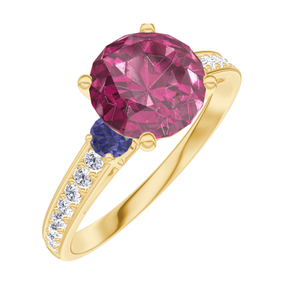 « L'ATELIER » NR. 167866Ring Geelgoud 9 karaat - Robijn rond 1 Karaat - Aanleunende edelstenen Blauwe saffier - Setting Diamant 4.8