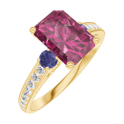 « L'ATELIER » NR. 168065Ring Geelgoud 18 karaat - Robijn Rechthoekig 1 Karaat - Aanleunende edelstenen Blauwe saffier - Setting Diamant 4.6