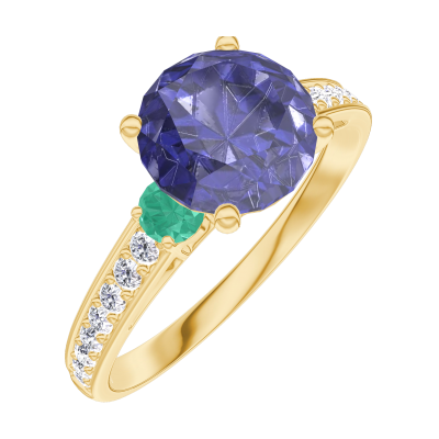« L'ATELIER » NR. 168486Ring Geelgoud 9 karaat - Blauwe saffier rond 1 Karaat - Aanleunende edelstenen Smaragd - Setting Diamant 4.8