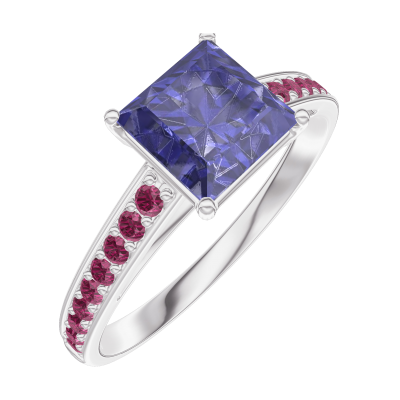 « L'ATELIER » NR. 168512Ring Witgoud 9 karaat - Blauwe saffier Prinses 1 Karaat - Setting Robijn