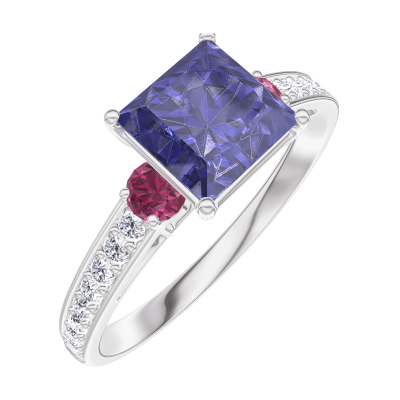 « L'ATELIER » NR. 168548Ring Witgoud 9 karaat - Blauwe saffier Prinses 1 Karaat - Aanleunende edelstenen Robijn - Setting Diamant