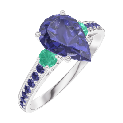 « L'ATELIER » NR. 168895Ring Witgoud 18 karaat - Blauwe saffier Peer 1 Karaat - Aanleunende edelstenen Smaragd - Setting Blauwe saffier