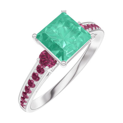« L'ATELIER » NR. 169151Ring Witgoud 18 karaat - Smaragd Prinses 1 Karaat - Aanleunende edelstenen Robijn - Setting Robijn