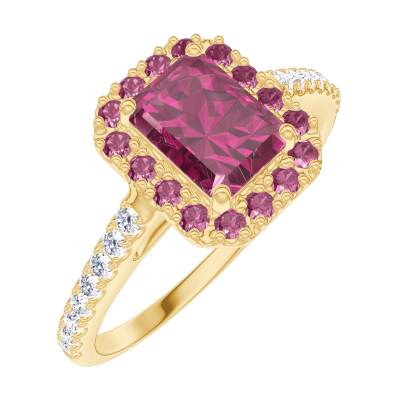 « L'ATELIER » Nº170406Ring Geelgoud 9 karaat - Robijn Rechthoekig 0.5 Karaat - Halo Robijn - Setting Diamant 4.7