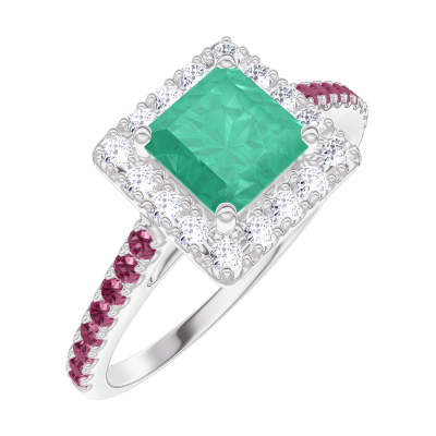 « L'ATELIER » NR. 170924Ring Witgoud 9 karaat - Smaragd Prinses 0.5 Karaat - Halo Diamant - Setting Robijn 4.1