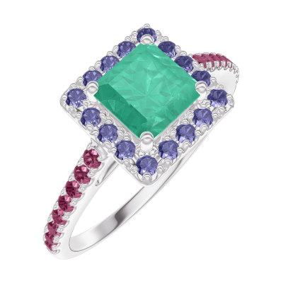 « L'ATELIER » Nº170955Ring Witgoud 18 karaat - Smaragd Prinses 0.5 Karaat - Halo Blauwe saffier - Setting Robijn 4.1