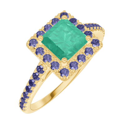 « L'ATELIER » Nº170957Ring Geelgoud 18 karaat - Smaragd Prinses 0.5 Karaat - Halo Blauwe saffier - Setting Blauwe saffier 4.1