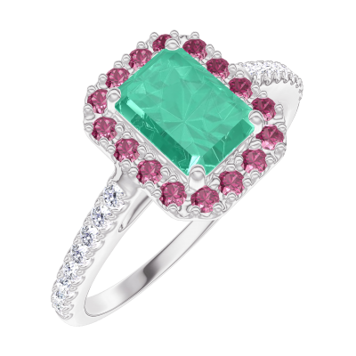 « L'ATELIER » Nº170983Ring Witgoud 18 karaat - Smaragd Rechthoekig 0.5 Karaat - Halo Robijn - Setting Diamant 4.7