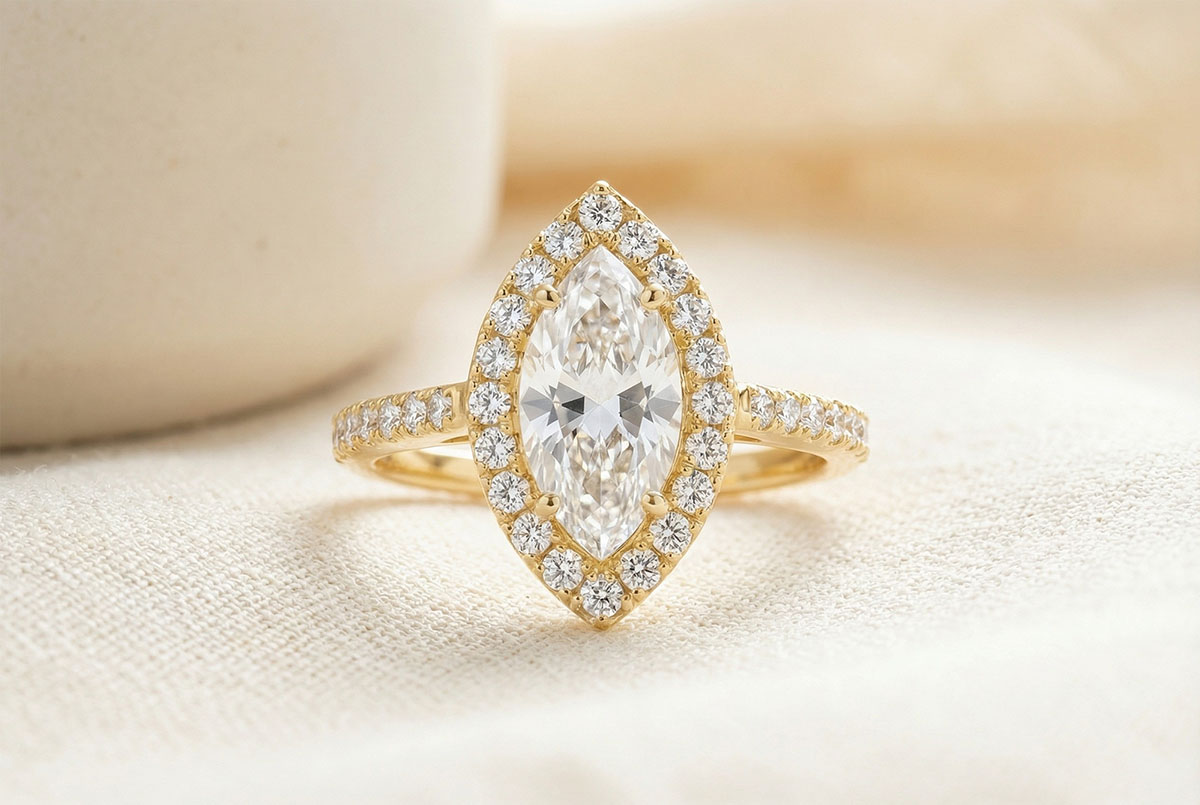 « L'ATELIER » NR. 190245Ring Geelgoud 18 karaat - Laboratorium diamant Markies 0.5 Karaat - Halo Laboratorium diamant - Setting Laboratorium diamant