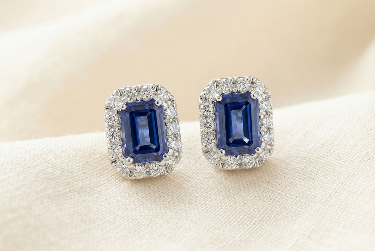 « L'ATELIER » NR. 201288Oorbellen Witgoud 9 karaat - Blauwe saffier Rechthoekig 0.3 Karaat (2 X) - Halo Diamant