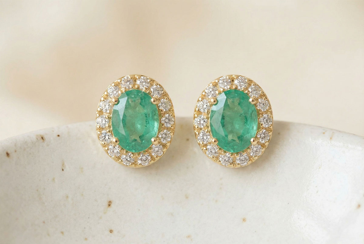 « L'ATELIER » NR. 201397Oorbellen Geelgoud 18 karaat - Smaragd Ovaal 0.3 Karaat (2 X) - Halo Diamant